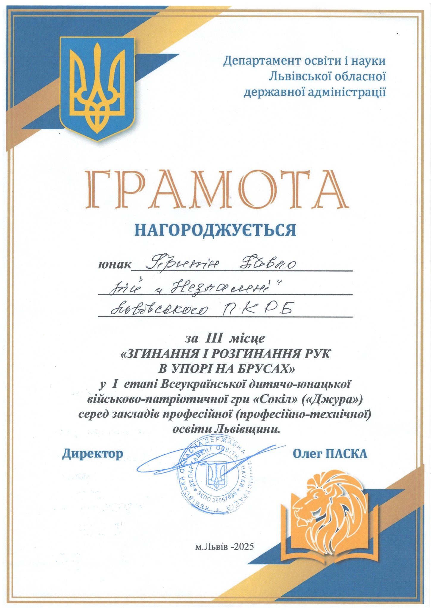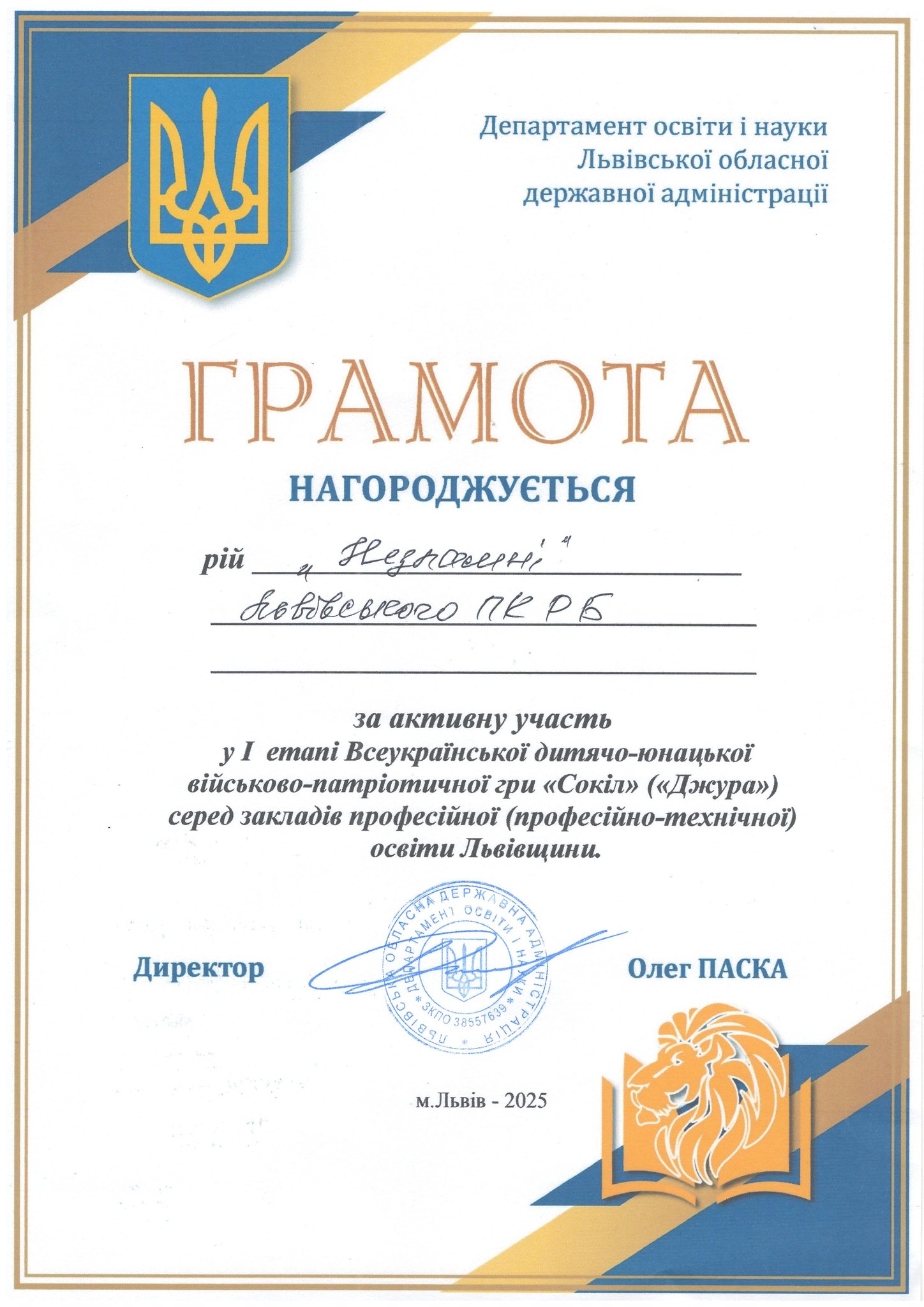 03 червня 2025 року під егідою Департамент освіти і науки Львівської ОДА розпочався І етап змагань Всеукраїнської дитячо-юнацької військово-патріотичної гри "Сокіл" ("Джура") серед учнівської молоді ЗП(ПТ)О Львівщини на базі Боринського професійного ліцею народних промислів і ремесл.