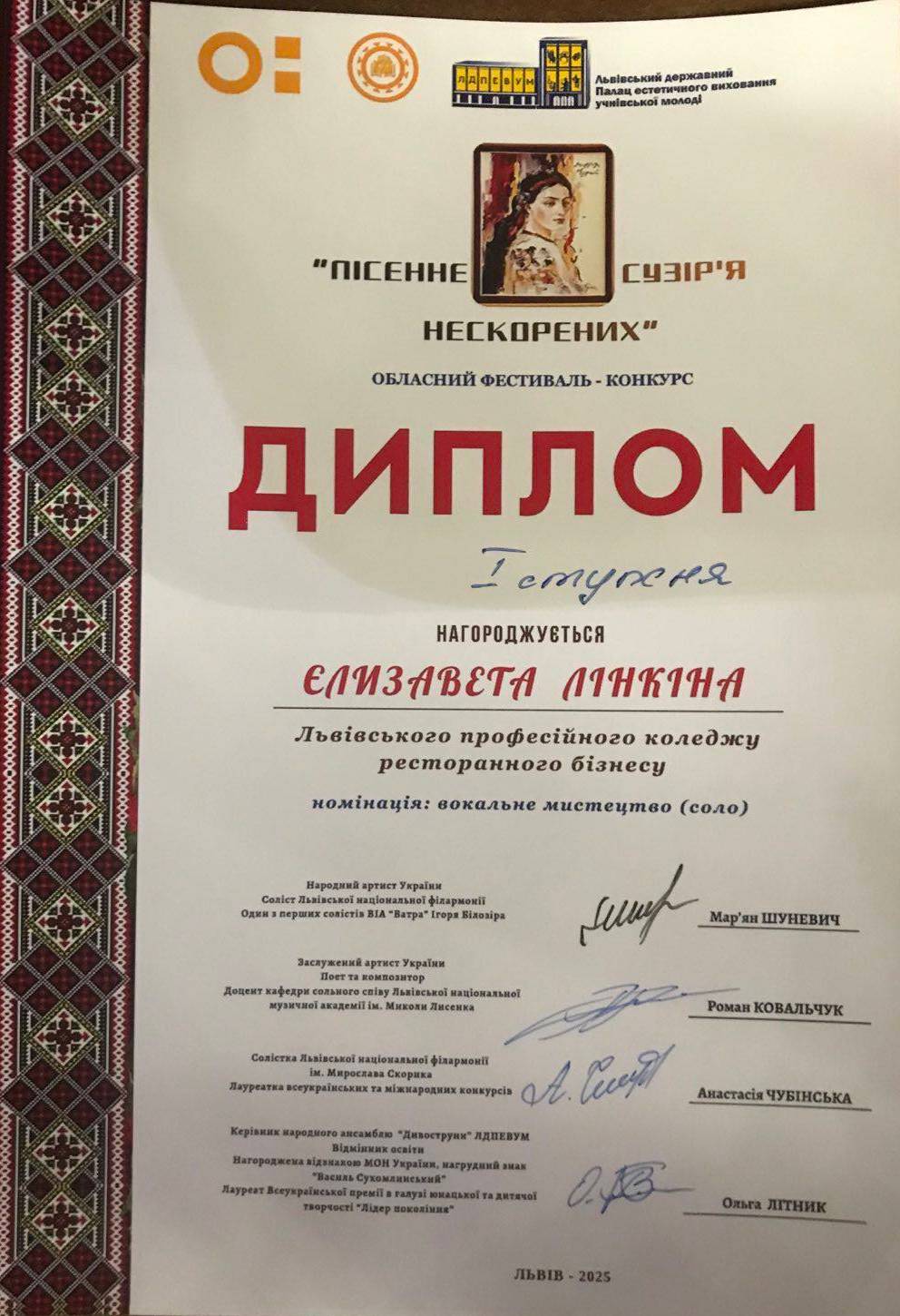 Чарівну, професійну Єлизавету Лінкіну - номінація: вокальне мистецтво (соло) диплом 1 ступеня.
