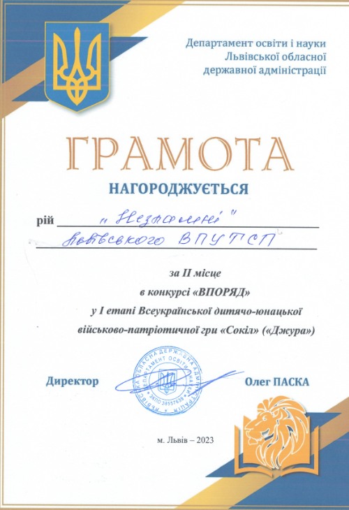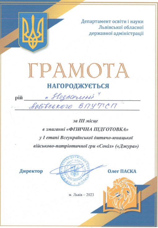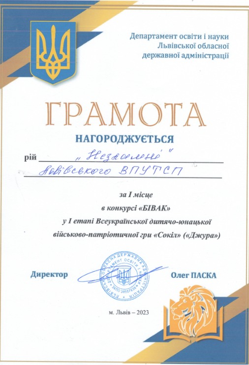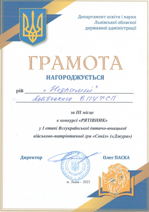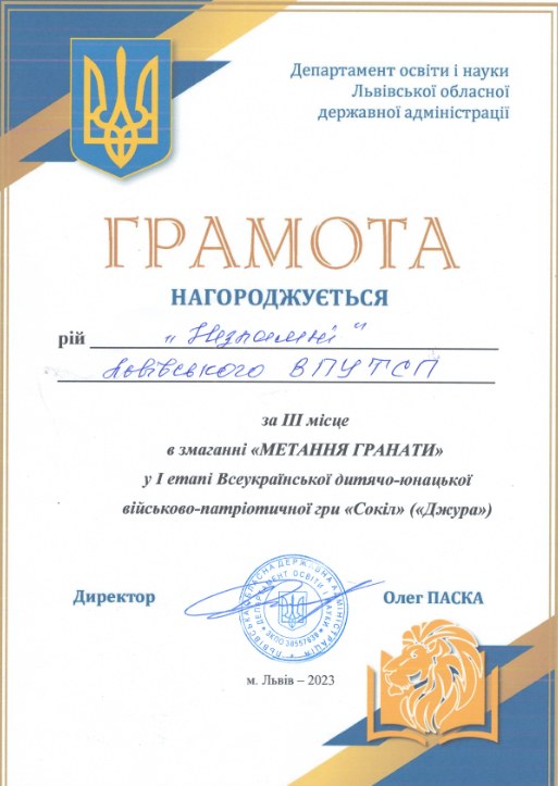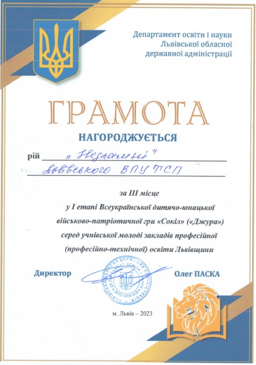 ІІІ місце у І етапі Всеукраїнської дитячо-юнацької військово-патріотичної гри «Сокіл» («Джура») серед учнів професійної (професійно-технічної) освіти 2023р.