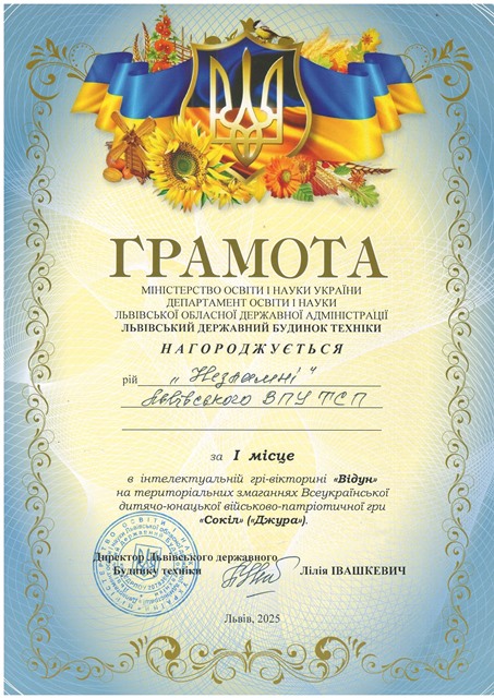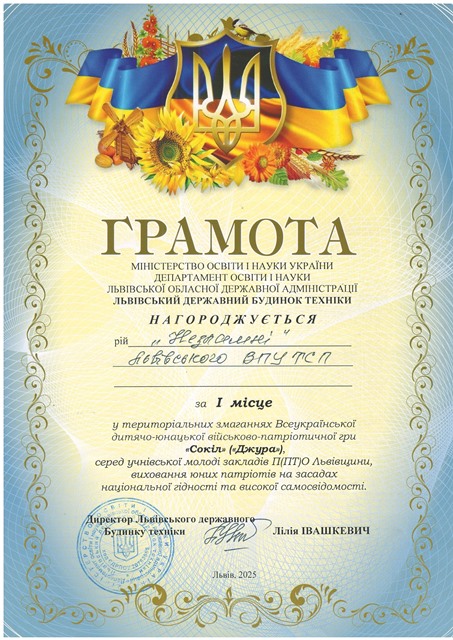 Вітаємо рій "Незламні", який здобув перше місце в підсумкових змаганнях, нагороджений Кубком та скерований на І етап змагань.